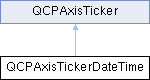 This QCPAxisTicker subclass generates ticks that correspond to real calendar dates and times. The plot axis coordinate is interpreted as Unix Time, so seconds since Epoch (January 1, 1970, 00:00 UTC). This is also used for example by QDateTime in the toTime_t()/setTime_t() methods with a precision of one second. Since Qt 4.7, millisecond accuracy can be obtained from QDateTime by using QDateTime::fromMSecsSinceEpoch()/1000.0. The static methods dateTimeToKey and keyToDateTime conveniently perform this conversion achieving a precision of one millisecond on all Qt versions.